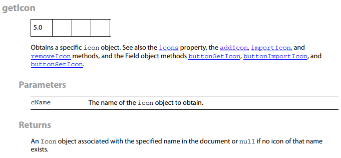 为了弄清楚 Javascript 做了什么,我们首先需要学习这两个 PDF JS API,this.getIcon() 和 util.iconStreamFromIcon()。 以下是 Adobe 参考文献的摘录。